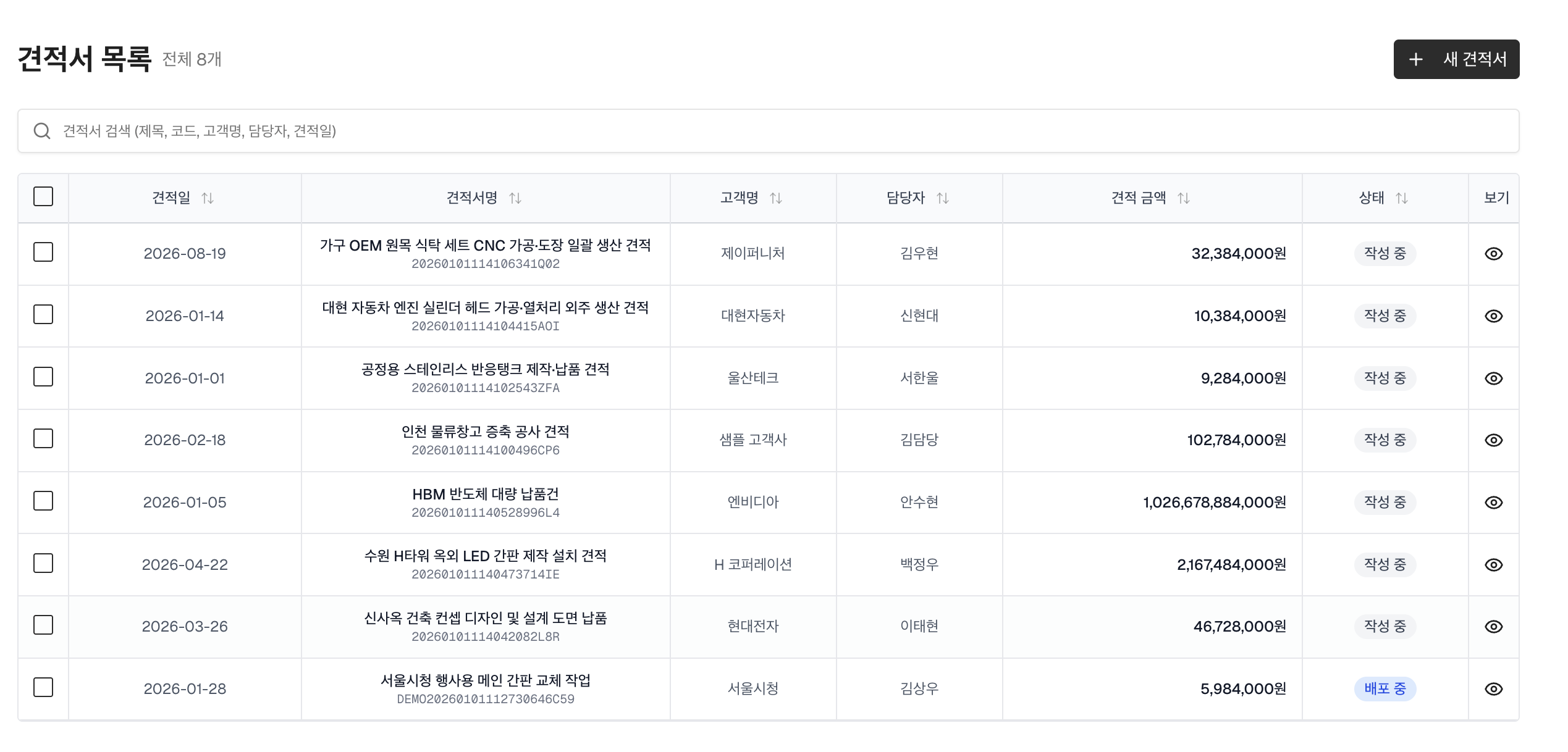 검색, 필터링, 정렬까지 — 견적서 관리가 이렇게 편할 수 있어요